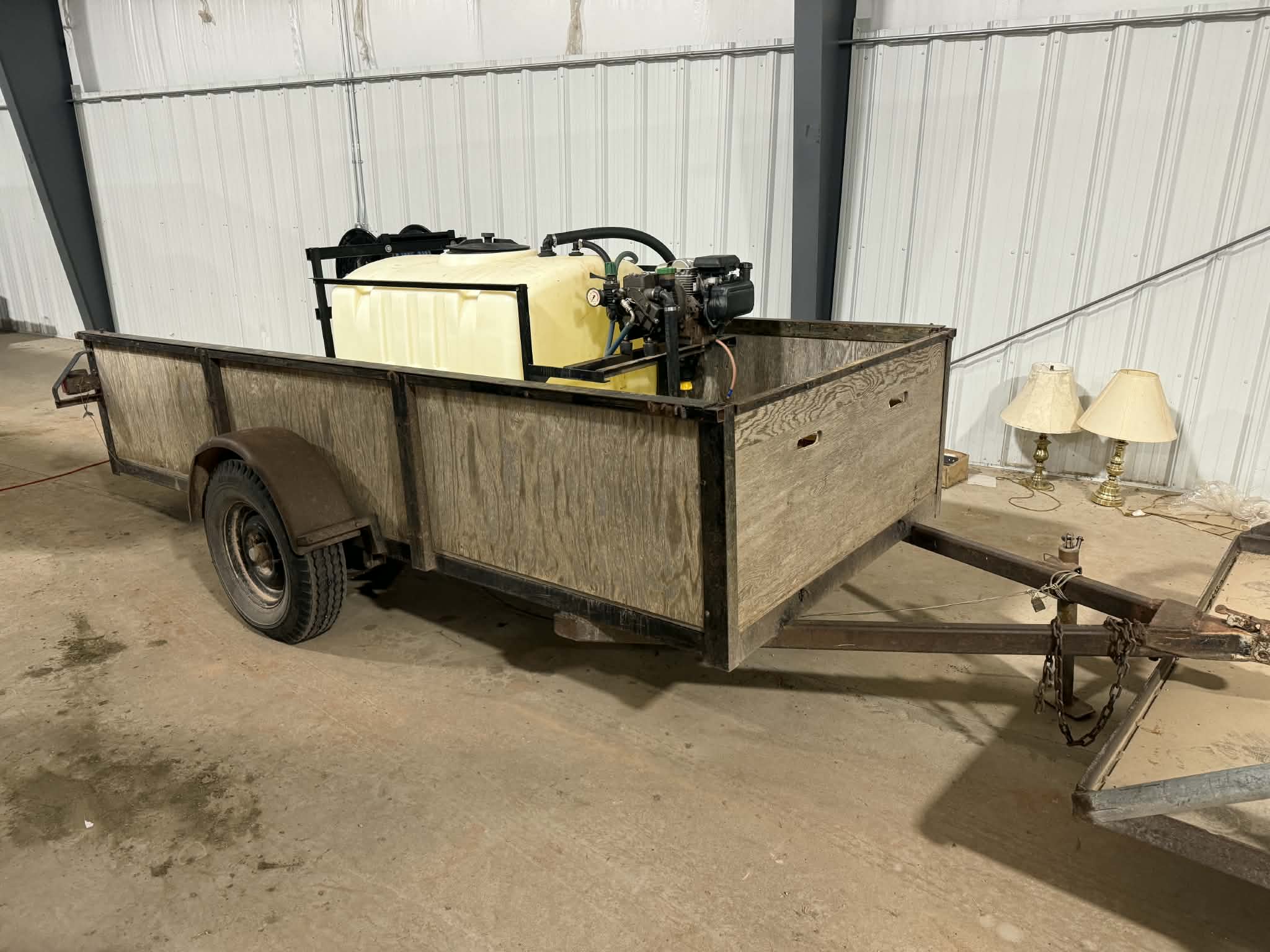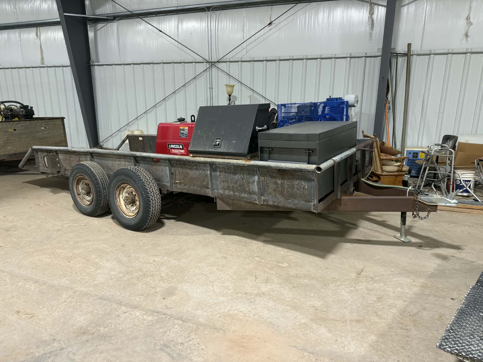 Lincoln Ranger 250 welder/generator low hours; Runnings job box; Quincy portable 30 gal. air compressor w/13hp Honda; Bright tread Alum. Fuel tank w/12 volt pump; 200 gal spot sprayer w/6hp Honda; 25- 36’ building trusses w/2’overhang; 28 rolls Professional large square baler twine; Gravely 60” zero turn mower; DR 20hp rotary mower; 220 volt hot water pressure washer; Lincoln Dial Arc sp-200 welder; rolling tool cabinet w/large selection of tools; portable air compressor; Battery charger; misc. equip. parts & hardware; Stihl weed trimmer; Plus more to be discovered.