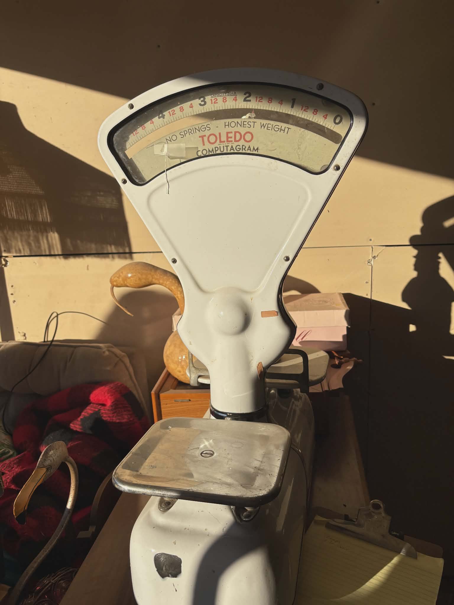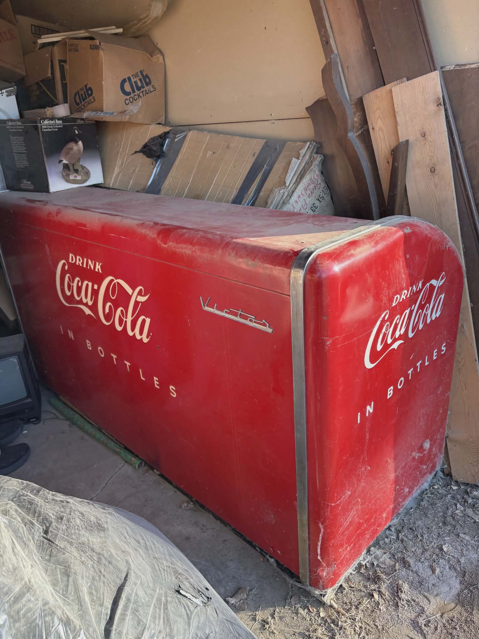 Antiques: Camelback trunk; (2) Matching patterned chairs; folding oak desk; large floral area rug; corner oak cupboard; Toledo Computagram Scale; John Wayne decanter and others; bar lights; floor lamps; round oak table w/claw feet; McGovern art; Coca-Cola chest cooler; dolls and other small antiques.