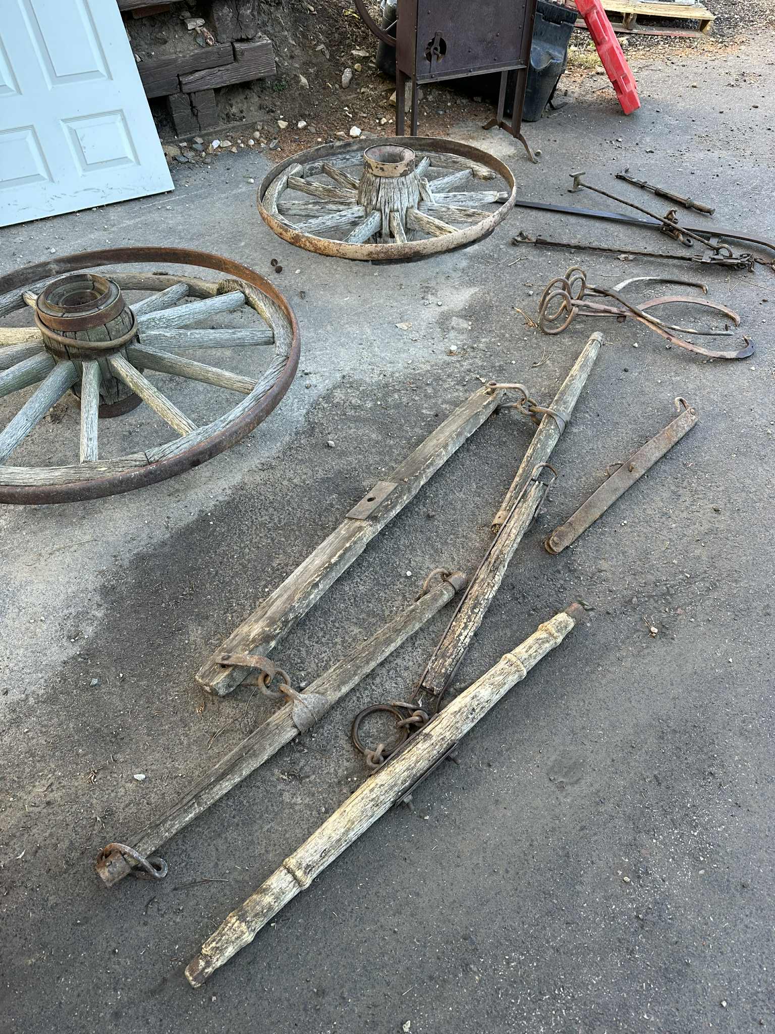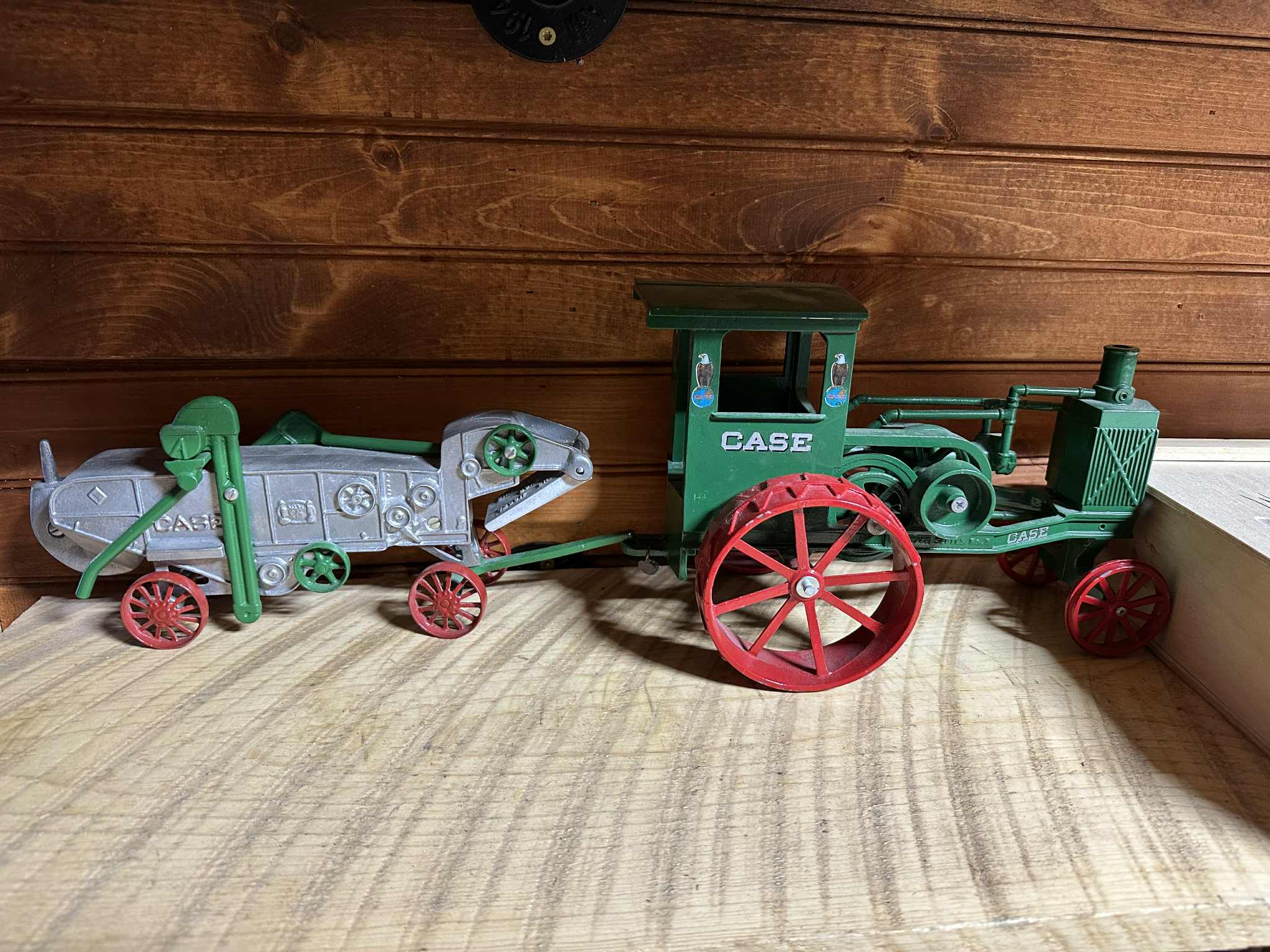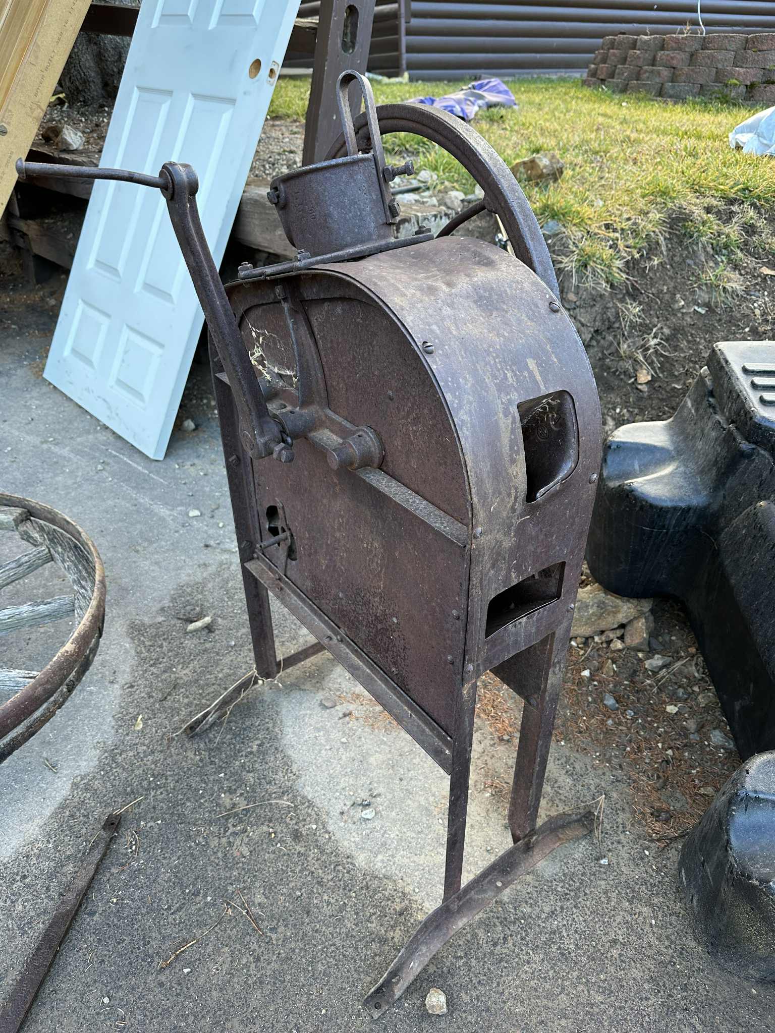 Including Jack Daniels barrel slats, glass top table, also 2 smaller Jack Daniels tables, unique; old leather & oak armchairs; many old vintage tools; bottle opener collection, many with advertising; nice camel back & steamer trunks; many “Dakota Farmer” magazines from 1916! Sad irons, gas iron, crocks & jugs; Case toy tractor & Threshing machine; sausage stuffer; Several unique photos and tin signs; glassware; kitchen step stool; mantle clocks; horse collar; cream separator; wagon wheels, ice tongs; harness & parts; hand crank corn sheller; and more!