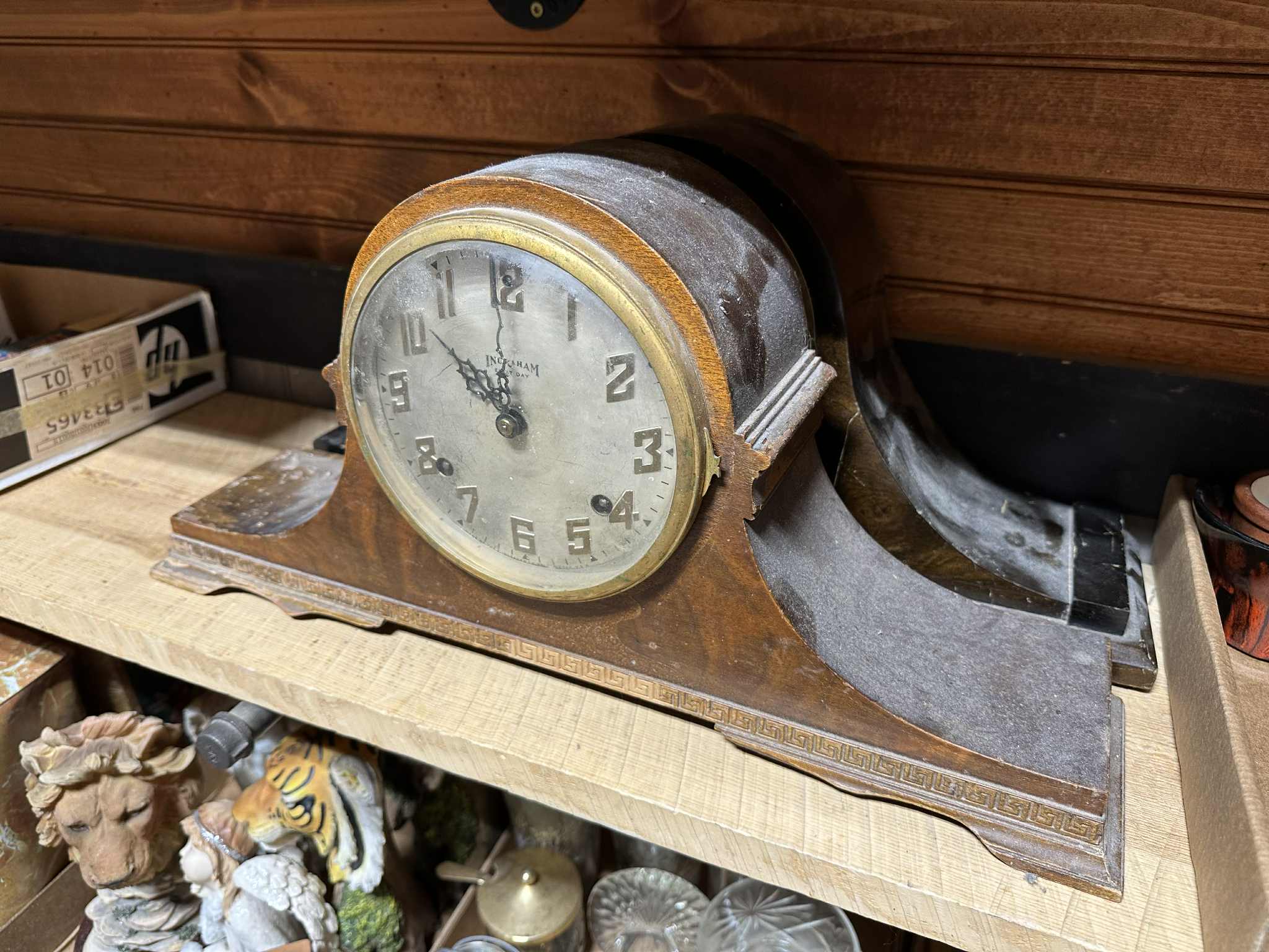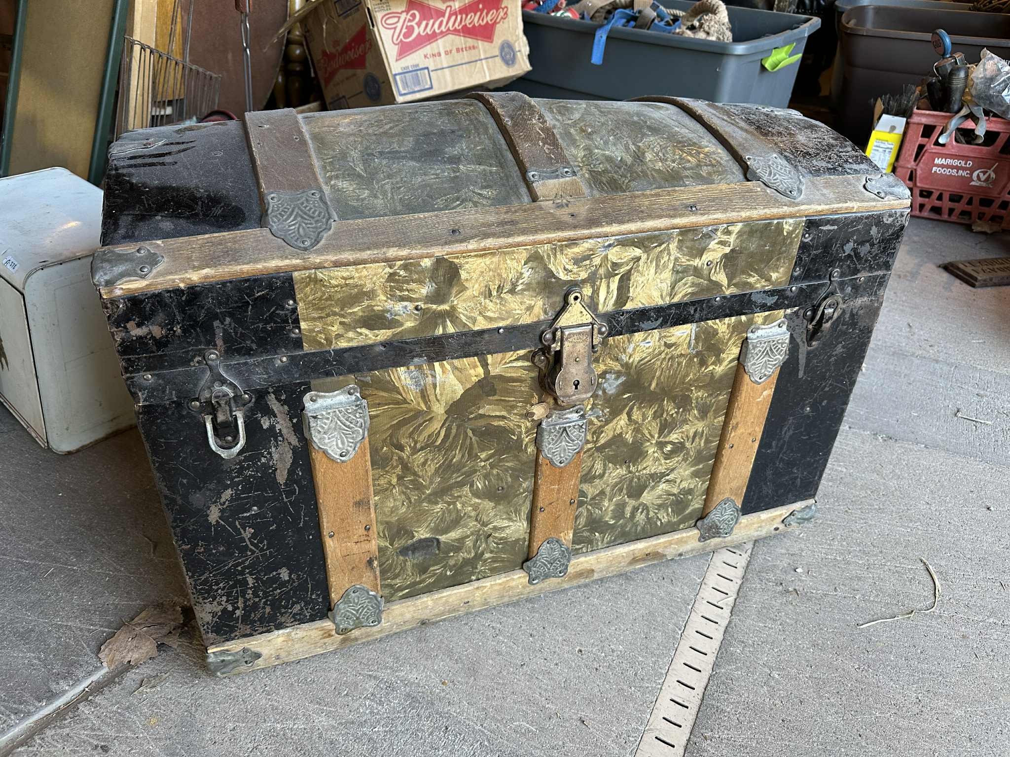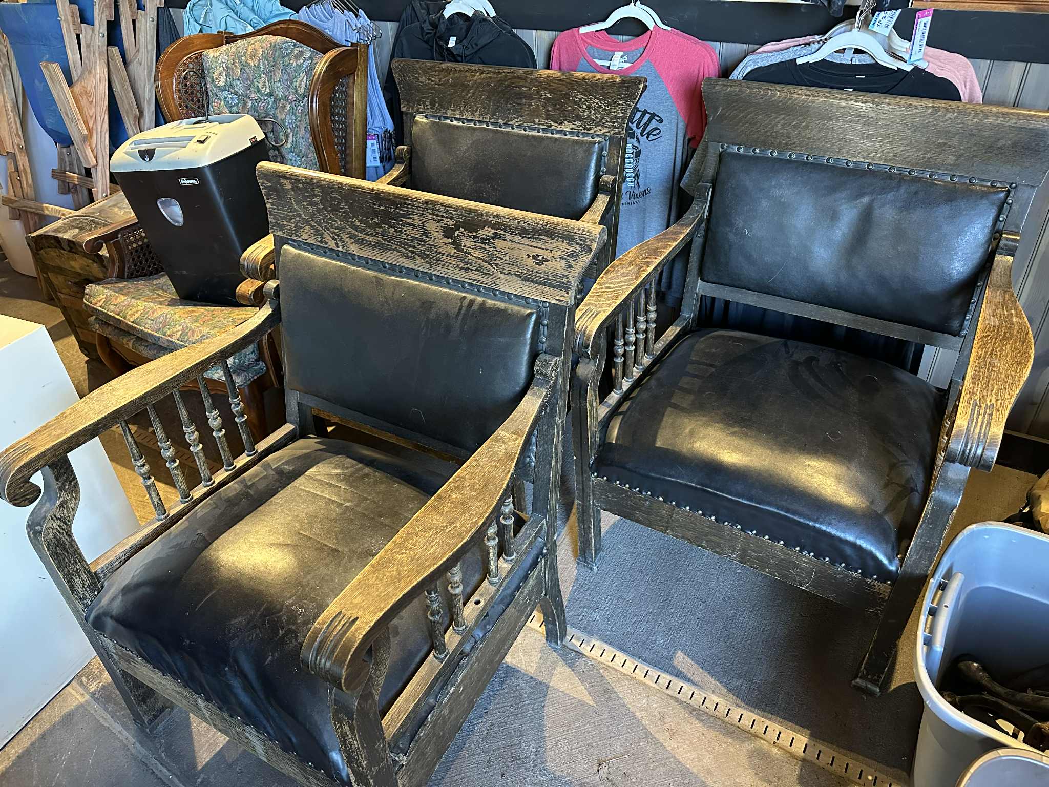 Including Jack Daniels barrel slats, glass top table, also 2 smaller Jack Daniels tables, unique; old leather & oak armchairs; many old vintage tools; bottle opener collection, many with advertising; nice camel back & steamer trunks; many “Dakota Farmer” magazines from 1916! Sad irons, gas iron, crocks & jugs; Case toy tractor & Threshing machine; sausage stuffer; Several unique photos and tin signs; glassware; kitchen step stool; mantle clocks; horse collar; cream separator; wagon wheels, ice tongs; harness & parts; hand crank corn sheller; and more!