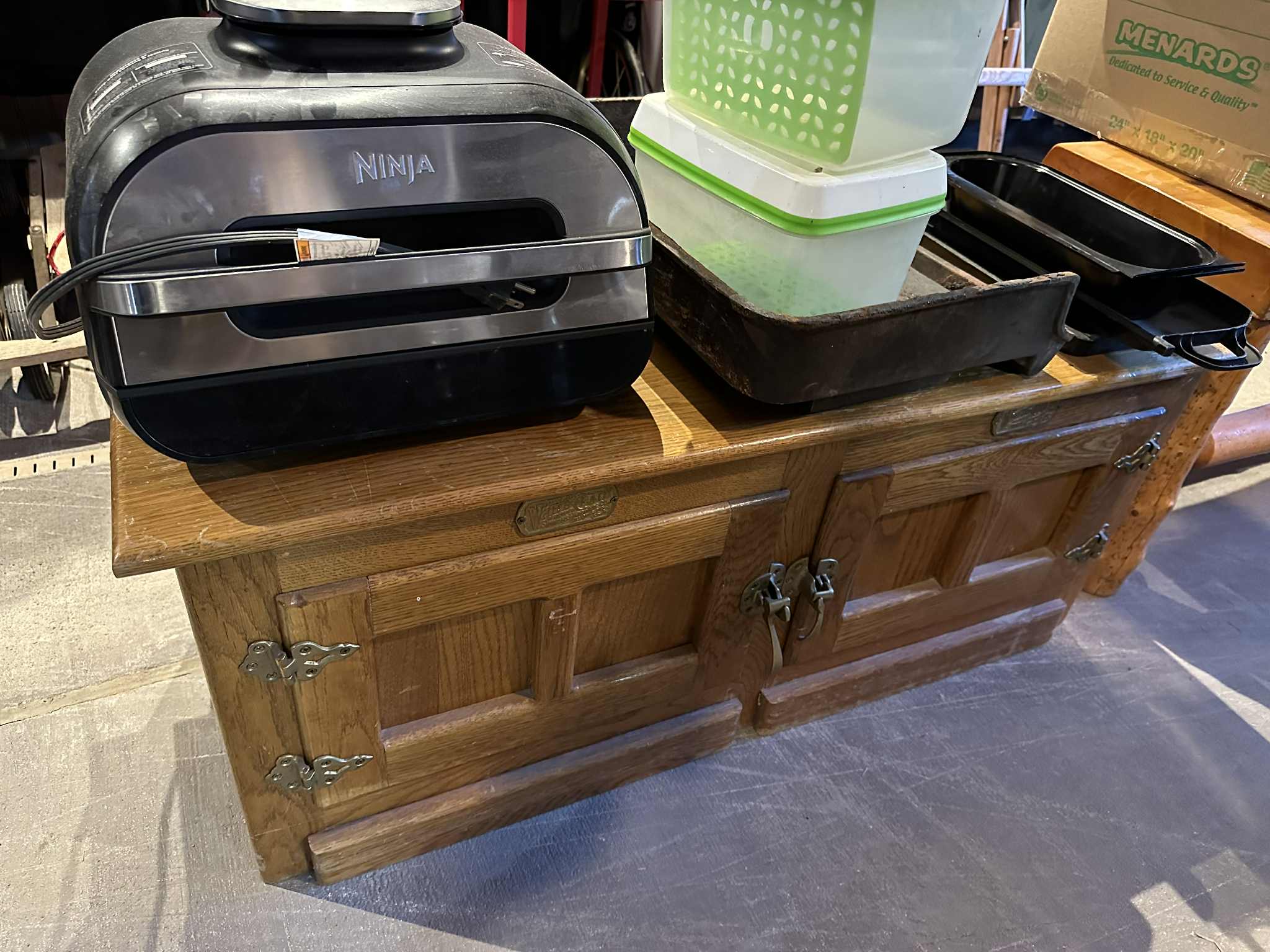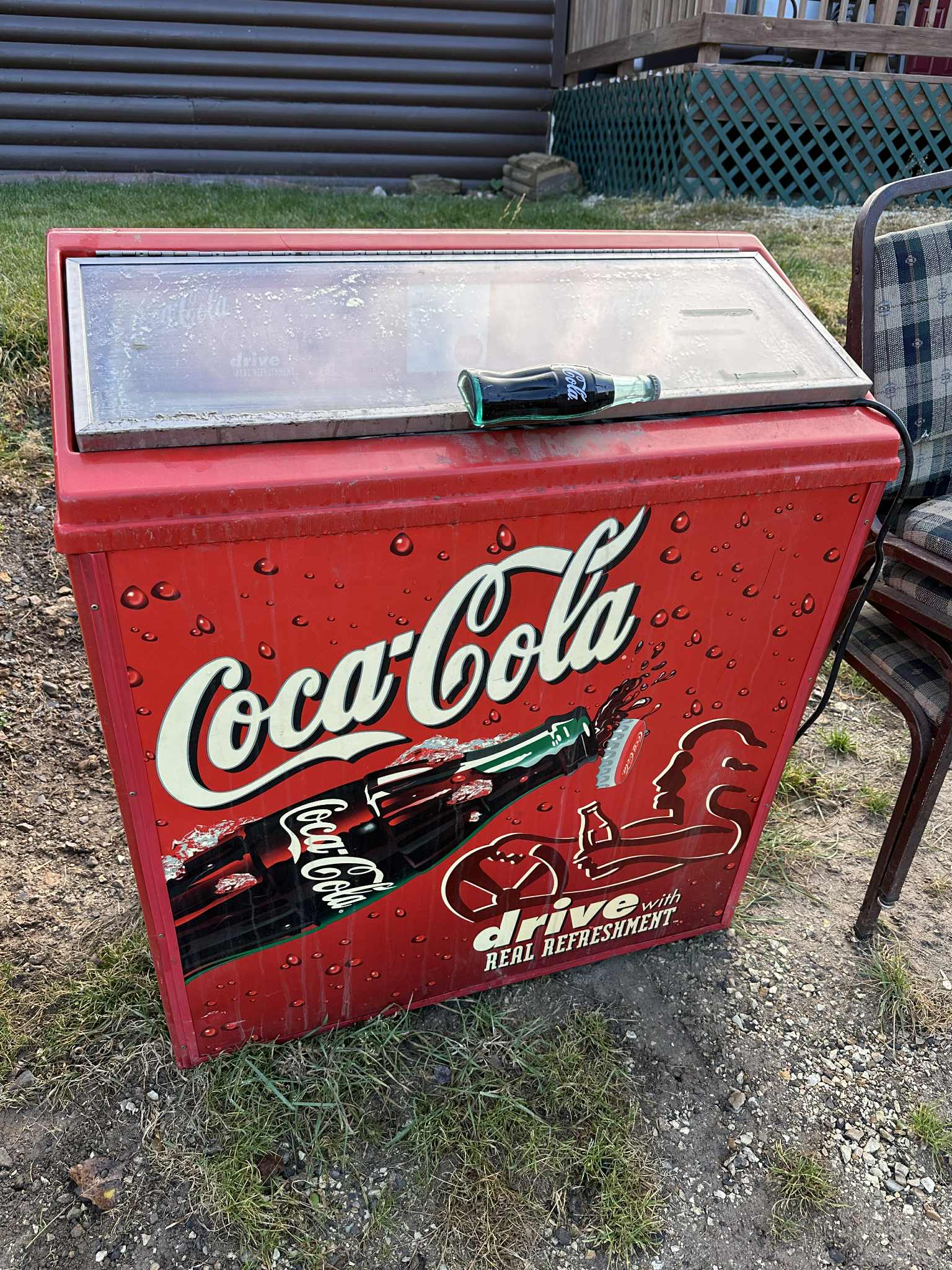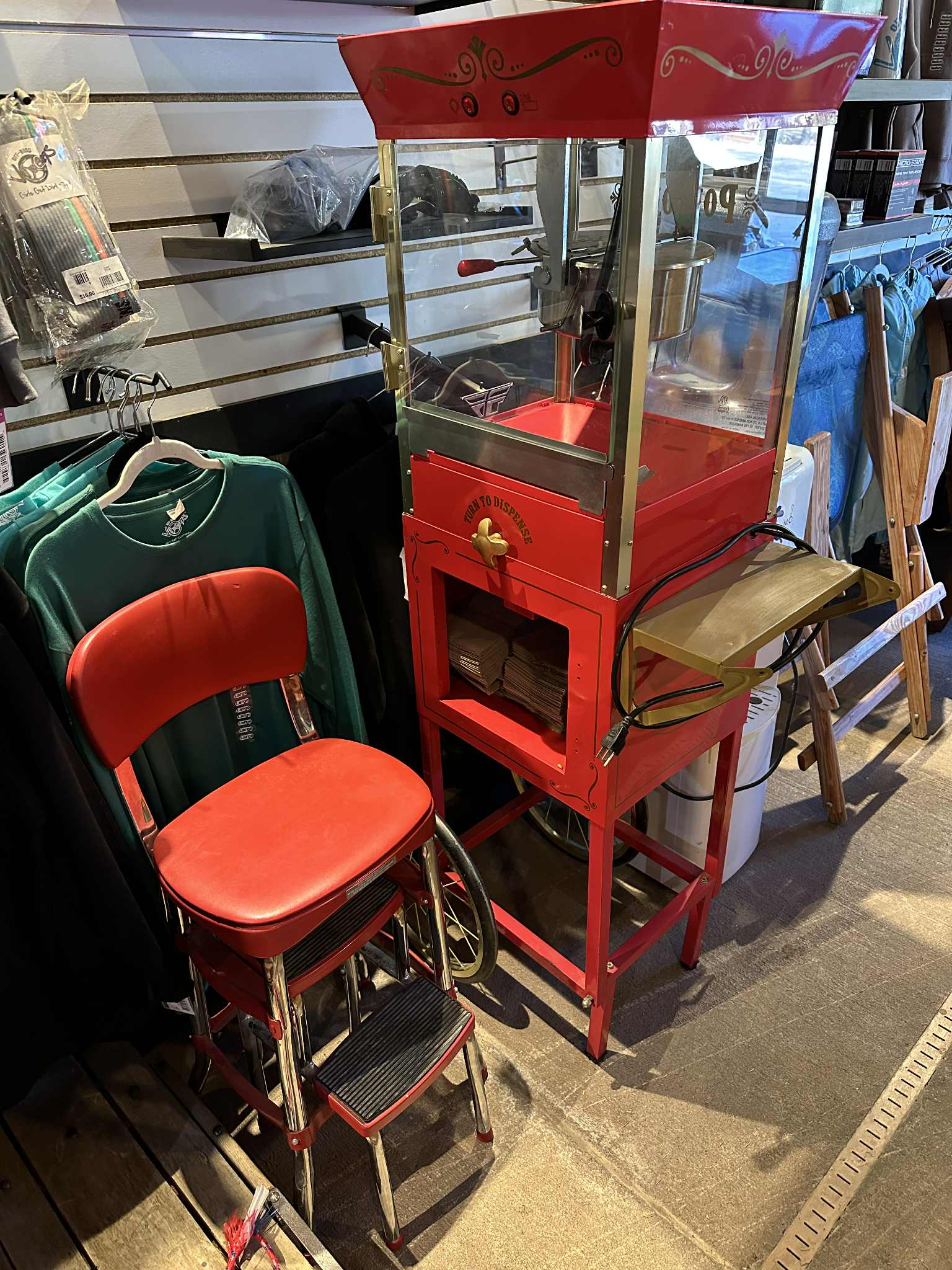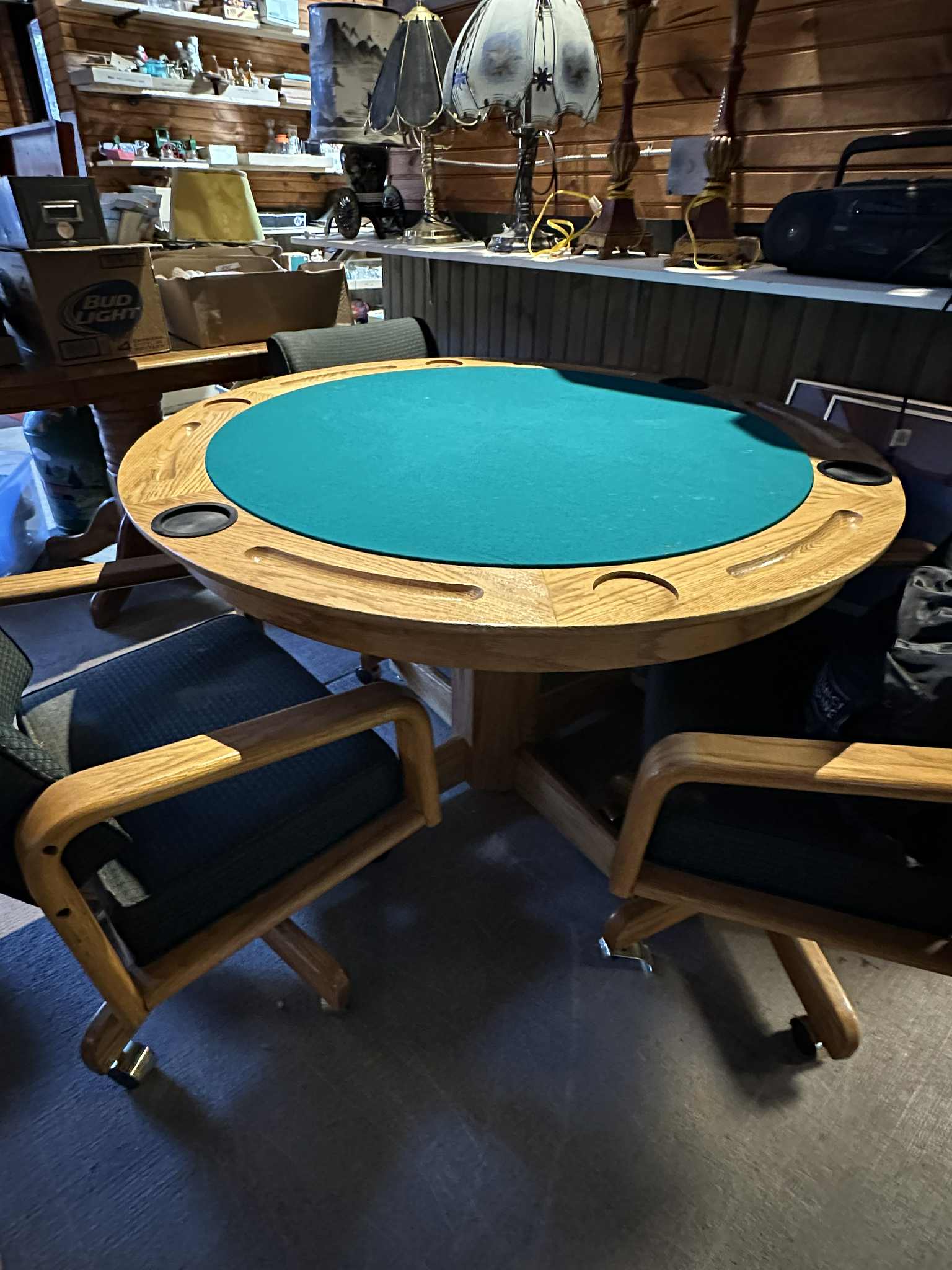 Solid oak poker table, green felt, cup/chip holders, tabletop reverses for solid oak top, nice! Old style popcorn machine on cart, nice; 200+ new pocketknives; small appliances; several stainless-steel pots, pans, trays, etc.; tables & chairs; Coca-Cola reach in cooler/refrigerator and much more!