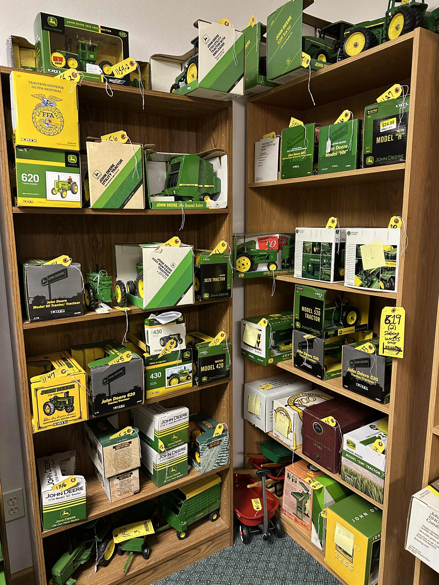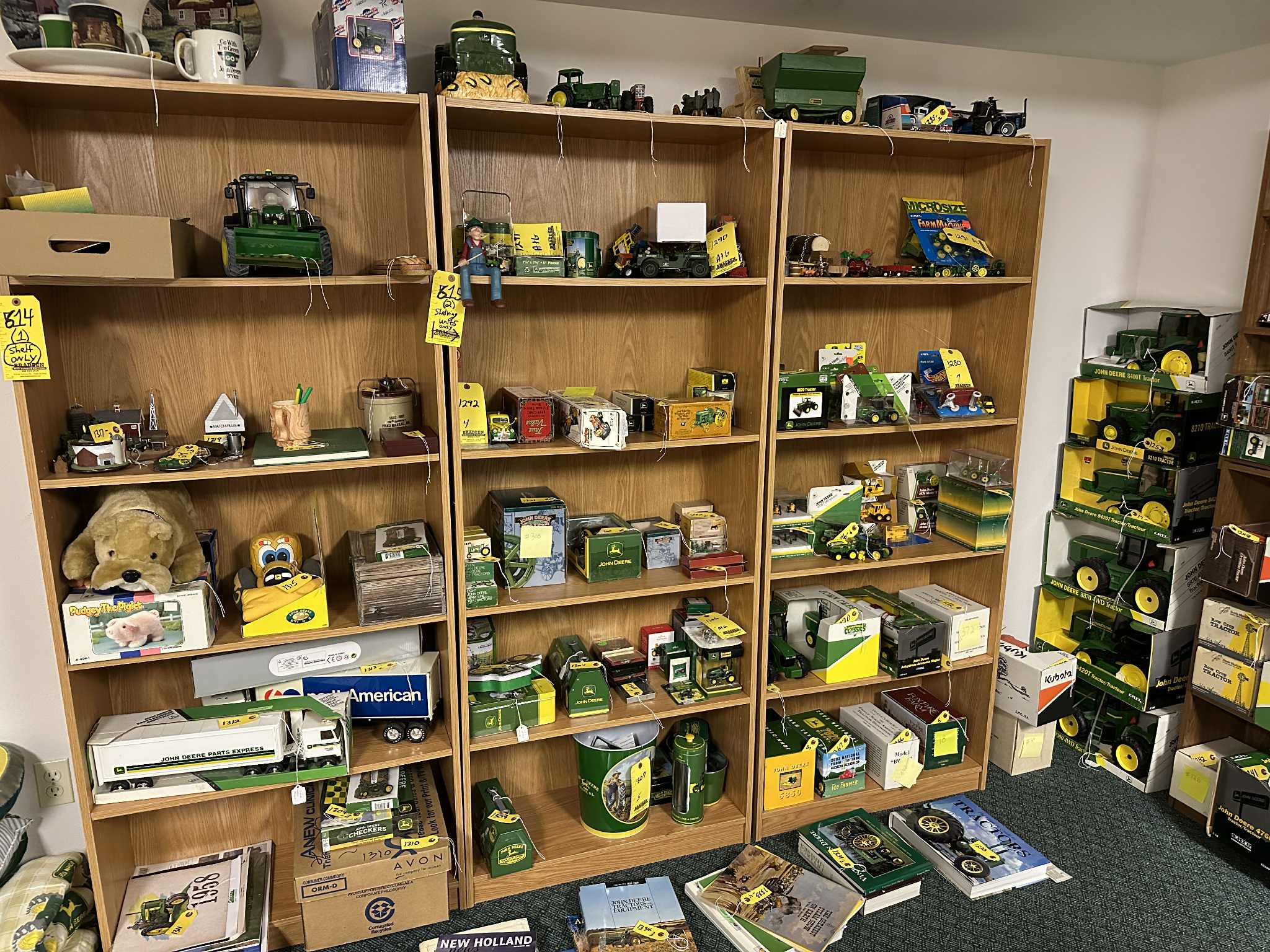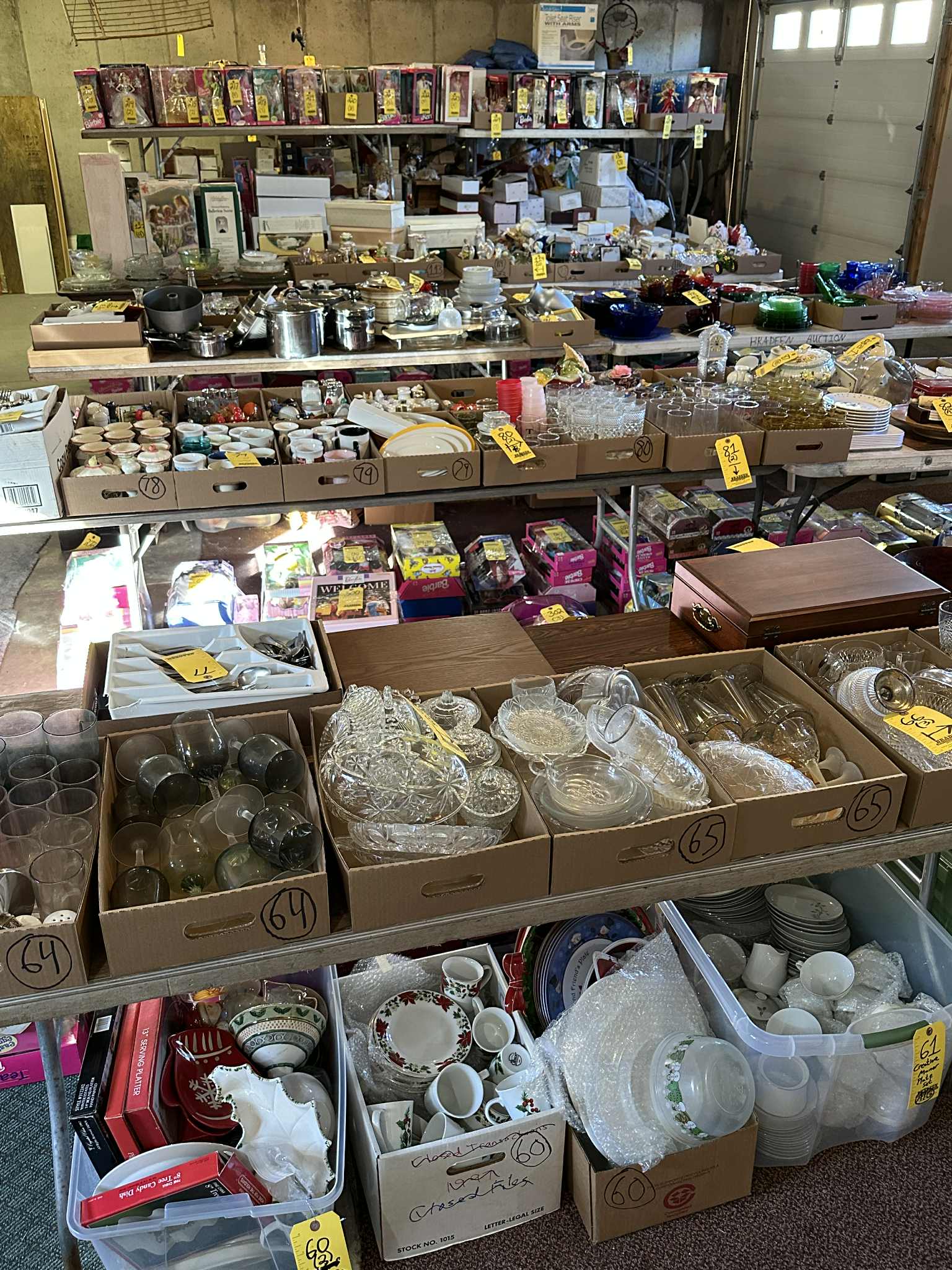 Featuring: MANY John Deere 1/16 scale ERTL & ERTL Precision brand Tractors, implements and assorted equipment, new in box and in pristine condition, also, John Deere advertising items, JD implement manuals, buckles, watches, lunch box, cookie jar, and more, a lifetime collection of Russ’!; Betty Wyatts impressive Doll Collection including several hundred “Barbie” dolls and accessories, also annual Holiday Barbies with matching ornaments from “90’s-00’s”, Shirley Temple doll collection; Dynasty Dolls, Edward Mobley Co. (Circa 1930’s), Aston Drake Gallery’s, several antique China dolls, and MORE!; Depression, Carnival, Ruby glass & more. Precious Moments & other figurines; music boxes and carousels; Household Furnishings, including kitchen appliances, mixers, crockpot, juicers, cutlery sets, lead crystal serving sets, as well a 100+/- piece dinner sets; Generational ceramic Salt & Pepper shakers: Aunt Jemima; Nanco Co.; Dairy cows; Campbell Soup and more; Quality furniture including, wooden rocker, church pew style benches, beautiful China hutches w/backlighting; matching bedroom sets (nice!); glass shelving unit; coffee table; lamps & chairs, and more; Books and literature; Large amount of Ladies’ jewelry & men’s/women’s clothing & apparel. Dozens of totes full of quality home decor, holiday decorations, and FUN ITEMS! Also, Shop and garden items & drills; socket sets; rolling toolbox; work benches; gardening, collection of antique tools, wagon wheels, and much, much more.