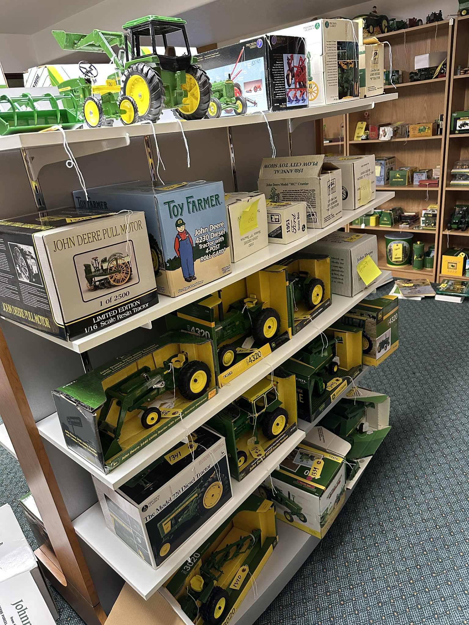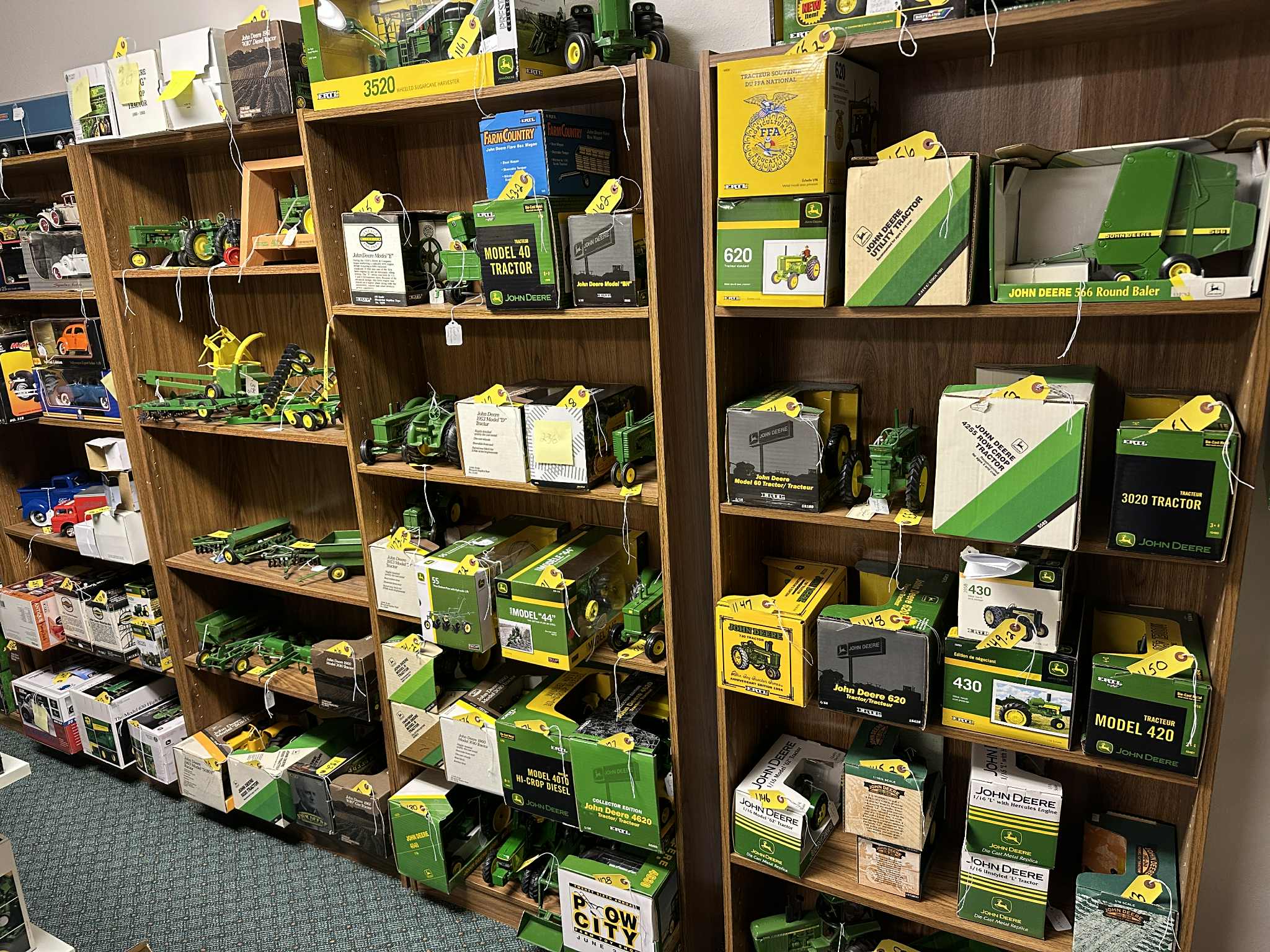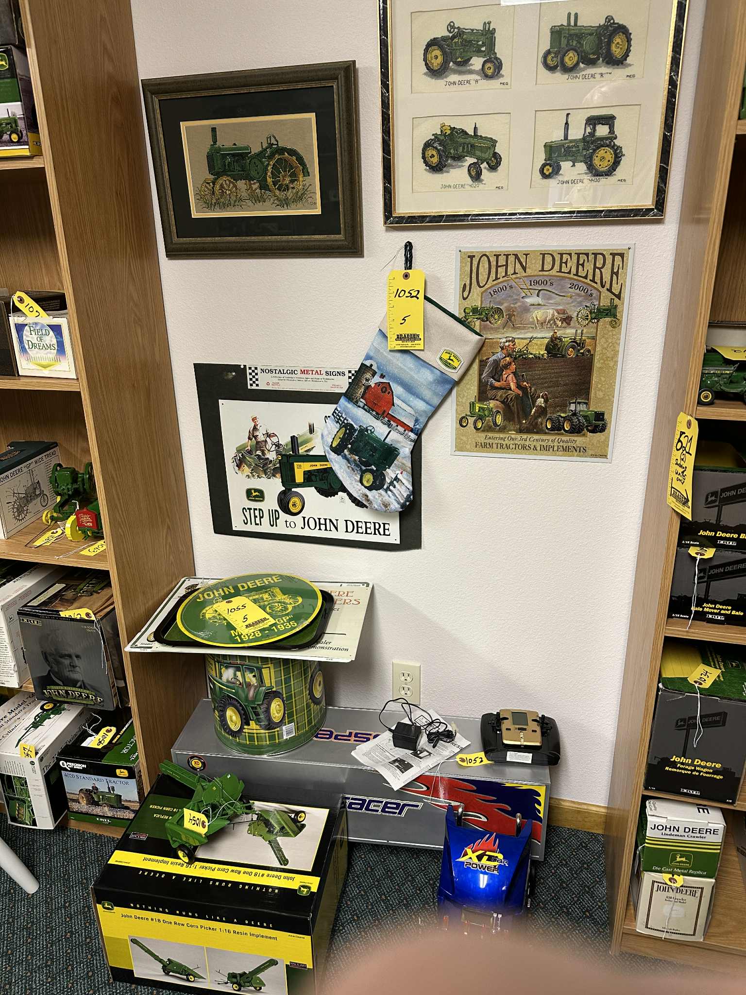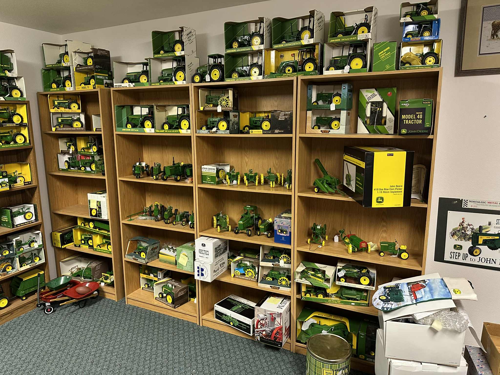 Featuring: MANY John Deere 1/16 scale ERTL & ERTL Precision brand Tractors, implements and assorted equipment, new in box and in pristine condition, also, John Deere advertising items, JD implement manuals, buckles, watches, lunch box, cookie jar, and more, a lifetime collection of Russ’!; Betty Wyatts impressive Doll Collection including several hundred “Barbie” dolls and accessories, also annual Holiday Barbies with matching ornaments from “90’s-00’s”, Shirley Temple doll collection; Dynasty Dolls, Edward Mobley Co. (Circa 1930’s), Aston Drake Gallery’s, several antique China dolls, and MORE!; Depression, Carnival, Ruby glass & more. Precious Moments & other figurines; music boxes and carousels; Household Furnishings, including kitchen appliances, mixers, crockpot, juicers, cutlery sets, lead crystal serving sets, as well a 100+/- piece dinner sets; Generational ceramic Salt & Pepper shakers: Aunt Jemima; Nanco Co.; Dairy cows; Campbell Soup and more; Quality furniture including, wooden rocker, church pew style benches, beautiful China hutches w/backlighting; matching bedroom sets (nice!); glass shelving unit; coffee table; lamps & chairs, and more; Books and literature; Large amount of Ladies’ jewelry & men’s/women’s clothing & apparel. Dozens of totes full of quality home decor, holiday decorations, and FUN ITEMS! Also, Shop and garden items & drills; socket sets; rolling toolbox; work benches; gardening, collection of antique tools, wagon wheels, and much, much more.